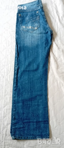 Дамски дънки " тинндо " Талия - едностранно : 43 см , Ханш - едностранно : 53 см , Дължина : 106 см , Вътрешна дължина : 81 см , Ширина на крачола - едностранно в бедро : 28 см , Ширина в глезен - едностранно : 26 см . На броени обличания са . Изпращам с Еконт за сметка на купувача .