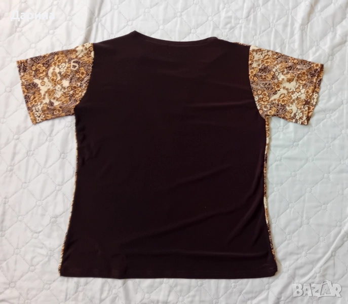 Дамска блуза , обличана е броени пъти . Дължина : 65 см , Ширина от рамо до рамо - едностранно : 45 см , Ширина от мишница до мишница - едностранно : 59 см , Ширина в кръста - едностранно : 58 см , Дължина на ръкав : 21 см . Изпращам с Еконт за сметка на купувача .