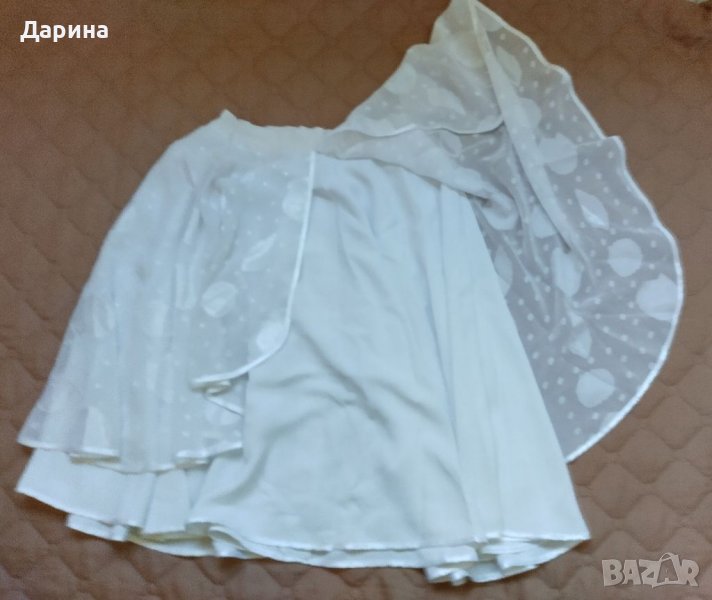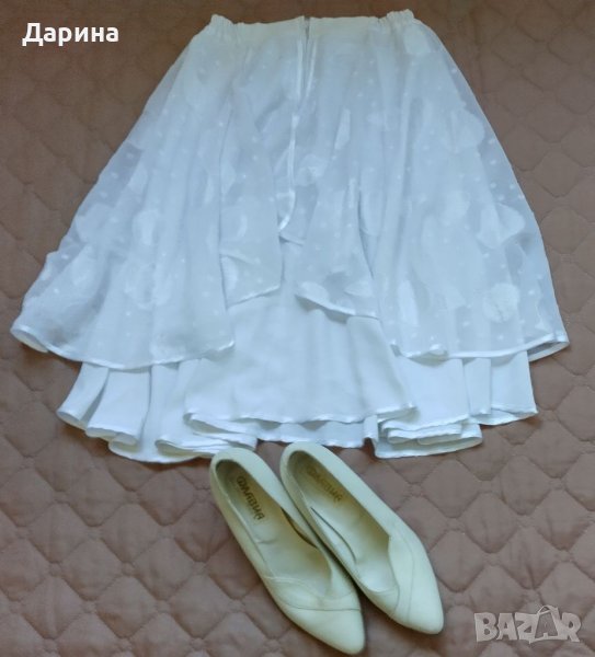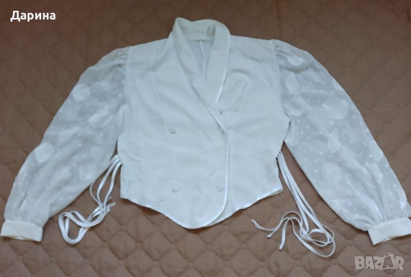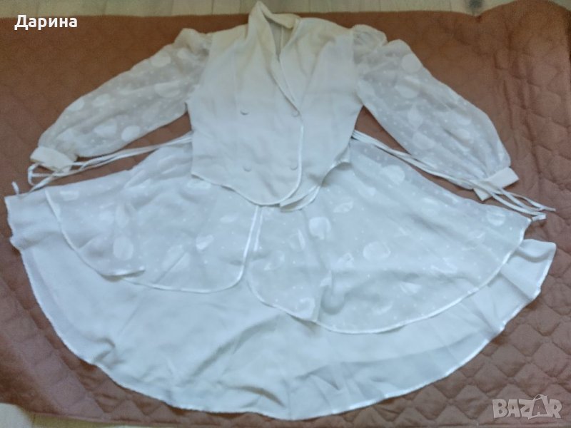 Костюм от две части : Риза ( тип сако ) с подплънки и прозрачни ръкави / Дължина отпред и в гръб: 60 см , Дължина в кръста: 44 см , Ширина от рамо до рамо - едностранно : 39 см , Ширина от мишница до мишница - едностранно : 49 см , Ширина в кръста - едностранно : 40 см , Дължина на ръкава : 60 см . Пола / талия : 30 см , дължина : 60 см .Обувки " флавия " номер : 40 ( 25 1 / 2 ) Цената е категорична Не подлежи на коментар . Изпращам с Еконт за сметка на купувача .