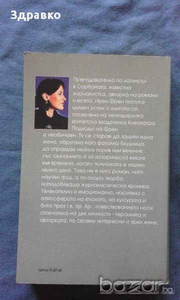 Преподавателка по латински в Сорбоната, известна журналистка, авторка на романи и есета, Ирен Френ постига шумен успех с книгата си, посветена на легендарната египетска владетелка Клеопатра. Подходът на Френ е необичаен. Тя се старае да защити една жена, обругана като фатална блудница, да оправдае нейния порив към величие със съзнанието ù за историческа мисия във времена, когато политиката е изцяло мъжко дело. Това не е нито, роман, нито научен труд, а по-скоро творба, наподобаваща журналистическа хроника. Увлекателно и емоционално, наситено с атмосферата на епохата, на културата и бита през І в. пр. Хр., повествованието носи отпечатъка на две личности - героинята и авторката, по своему интересни и ярки жени.