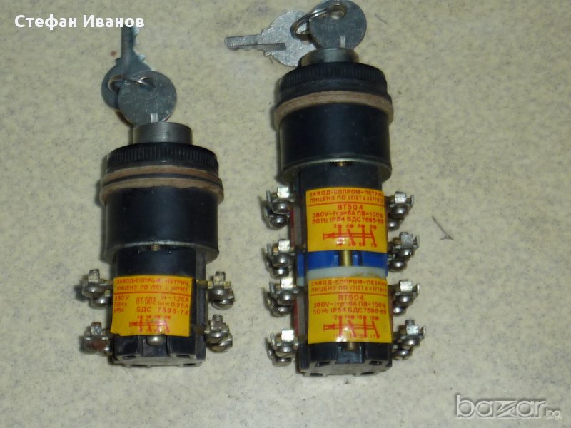 Продавам превключватели, ключове със заключване, до 380в. Нови са, никога не са ползвани. Българско производство. Обща цена за двата 17лв., може да се изпратят и с бг. пощи след предварителен запис от 17лв. По отделно - по договаряне - 10 и 8лв. При интерес могат да се намерят още 2-3бр. от по-малките.