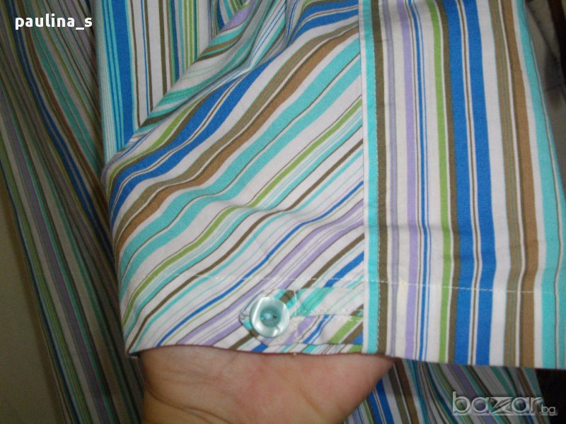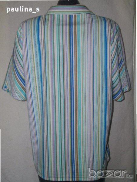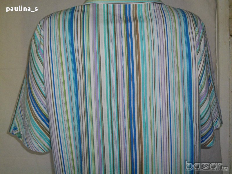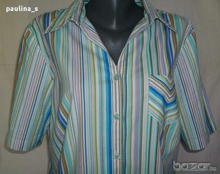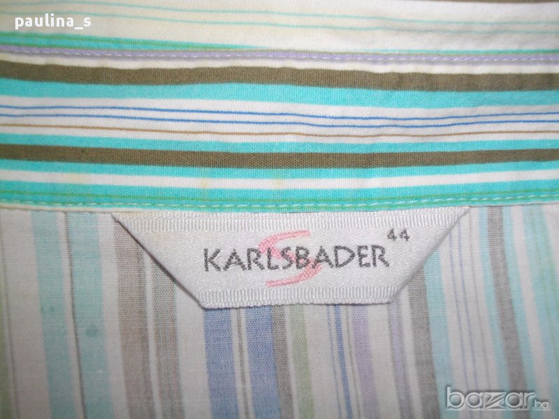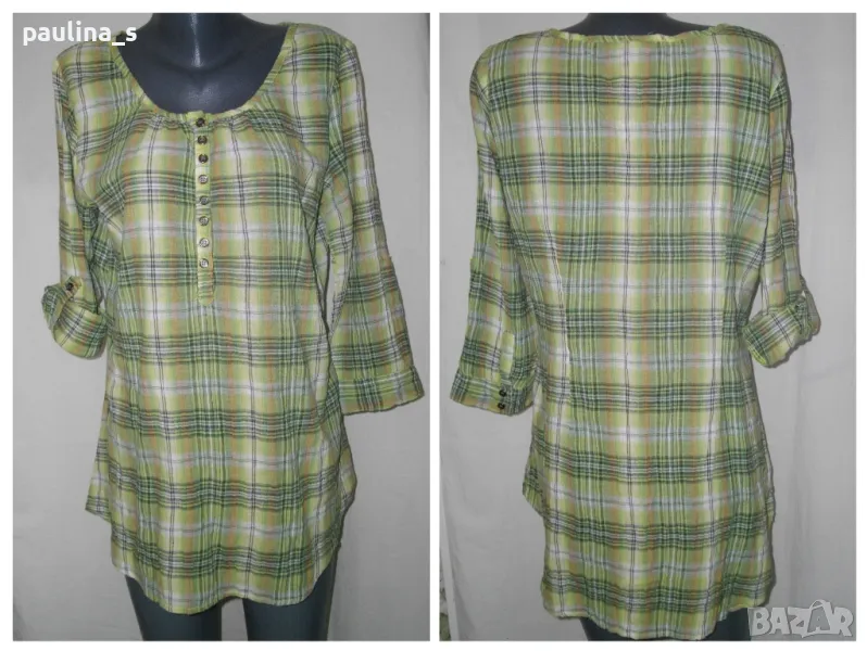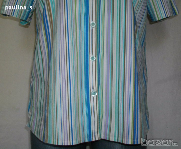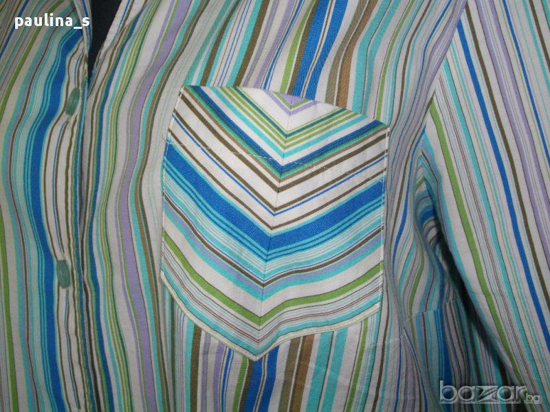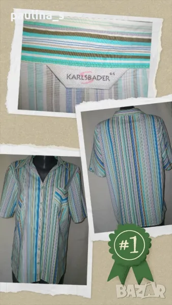 1️⃣ . Колаж / L / 2XL - "Karlsbader". Цената е крайна 22,5 евро. Дамска дизайнерска риза, тип туника. Материята е памук и ликра, десенът е в зелено синята гама. Моделът е спортен с шипц деколте и кокетно веревно джобче отпред, ръкавите са също веревни отзад и декорирани с копчета. Закопчаването е отпред със седефени копчета. Без дефекти и етикет, като нова е.