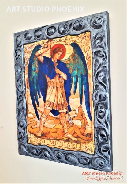 Репродукция на икона Свети Архангел Михаил, избор на изображения, ръчна изработка (техника декупаж) върху дърво.