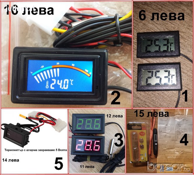 Обявата само за Варна лично предаванеТермометър цифров с аларма звукова.При превишаване на настроената температура имаме звукова аларма и премигване на показваната температура.Размери: 48×29×21mmРазмер: 45.5 × 26.5mmТемпературем обхват: -50 - 110 градусаРезолюция : 0.1 degreeОпресняване: 2 secТочност ± 1 degreeЗахранващо напрежение: DC 5 ВолтаДължина на кабела: около 1mЦвят: черенПри необходимост предлагам други сонди с цена 3 лева (но се налага запояване на кабелите - буксата се различава.)За други захранващи напрежения имам захранващ модул на цена 2лева. Имам и мини захранване 220В АС на 5 Волта