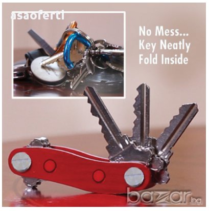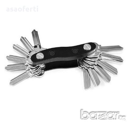 Хитър ключодържател от ново поколение, забравете за дрънкащите халки. Много компактен и с възможност да е еднакво удобен както за 2, така и за 12 ключа. Направен от самолетен алуминии, изключително здрав и лек. Можете да го използвате и за usb памети, карти за отстъпки и др.