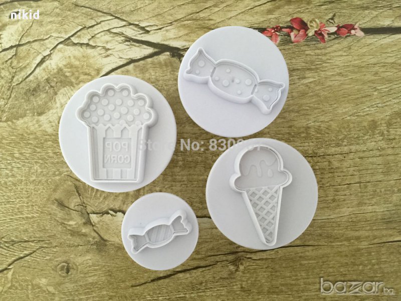 4 бр лакомства пуканки сладолед бонбон форми резци с бутало украса декор торта фондан форма резец → Обява 14908152