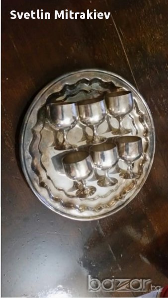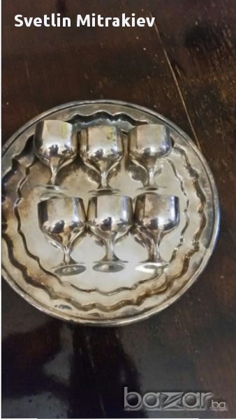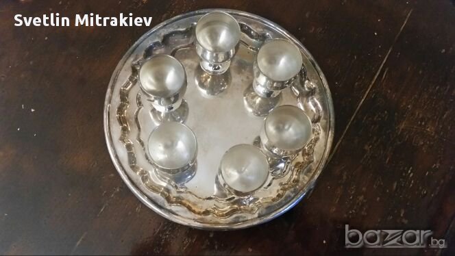 Посребрен сервиз от 7 части, диаметър на подноса 21 см. Височина на чашите 5.5 см. Сервиза е нов и не е ползван.