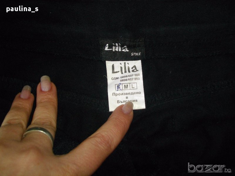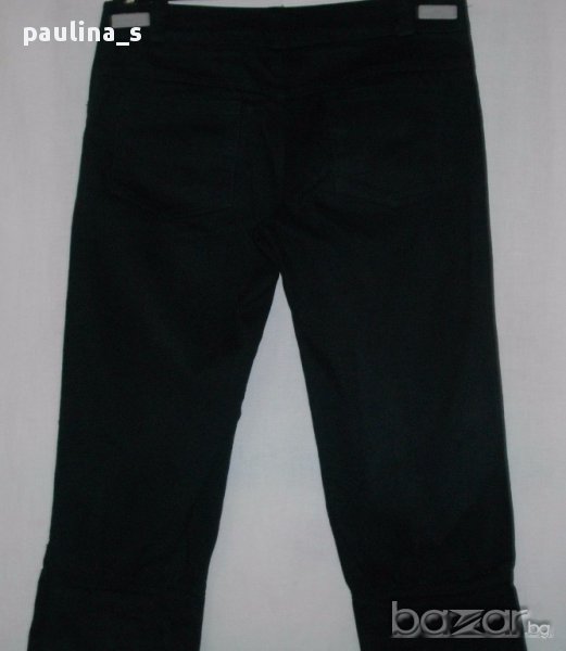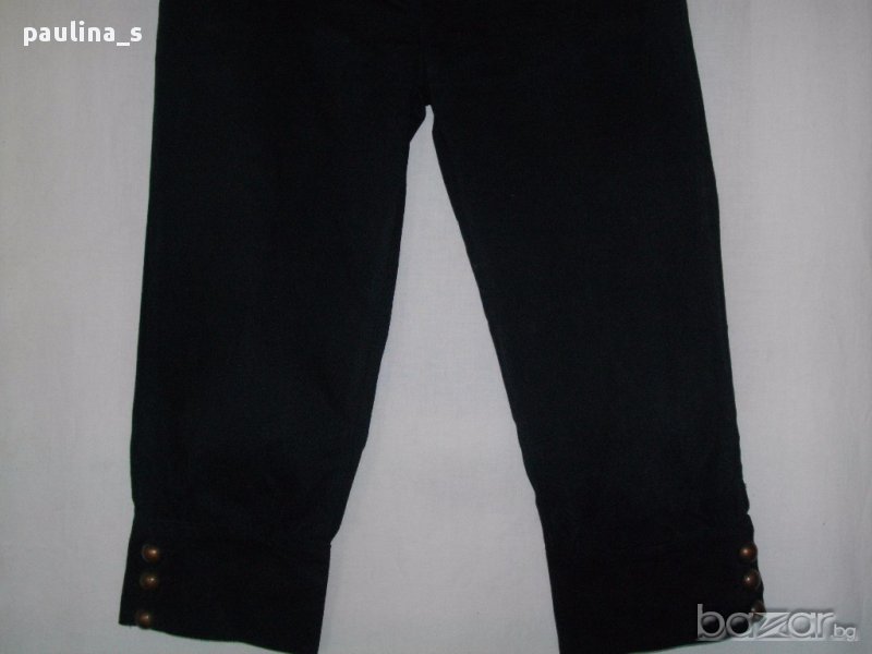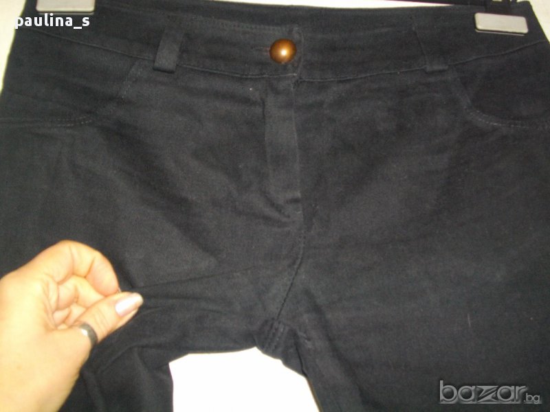 Дамски черни дънкови бермуди с плюшен ефект. Моделът е "5 pocket denim"- горе, като отпред няма джобове, а само имитация на такива, за са не се променя шейпът. Отзад джобовете са стандартни, като крачолите завършват с тесен маншет с 3 бр копчета и лек набор над него. Платът е с плюшен ефект, луксозен и умерено еластичен.