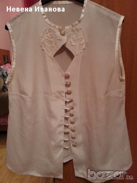 Бяла лятна блуза уникат с копчета без ръкав, отпред от двете страни с 2 апликации бродирани розички, лека копринена материя, ивиците са от бял сатен, с копчета с външни илици, около № 44-46 българска номерация, бюст отпред 48-50 см, дължина 56 см. Блузката я предлагам като нова, само е пробвана.