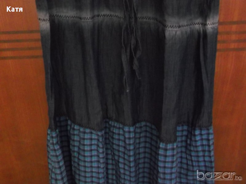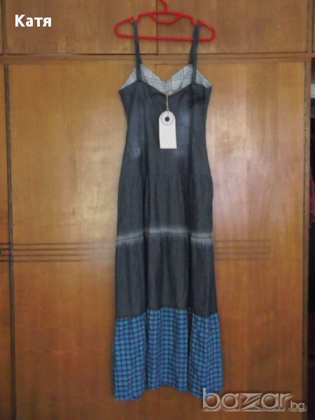Нова, с етикет, дълга дънкова, синя, лятна рокля с презрамки, ефектно комбинира бродерии, дънков и кариран плат, за детайли - вижте снимките, от тънка материя, подходяща за лятото. Размер 42 / L, за висока дама над 165 см, иначе ще Ви е дълга. Бюст 44 см, талия 41 см, ханш 60 см, дължина от под мишницата 125 см, дължина от рамо 146 см. Размер 42 / L.