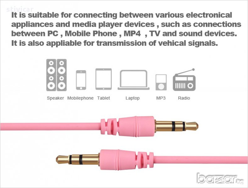 Кабелът е подходящ за свързване на устройства с аудио вход, пр. телефон към AUX вкъщи или в автомобил.