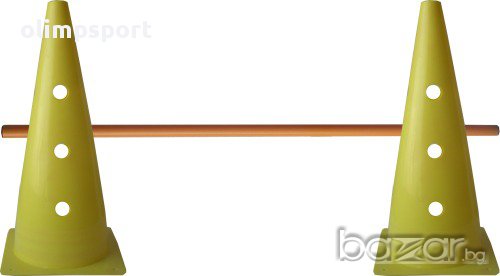 Конус с дупки и височина 38см. Дупките са с диаметър ф30мм. Дават възможност за поставяне на тояжка за образуване на препятствия от два конуса и една тояжка. Лесно сглобяване чрез втъкване на прътовете в отворите на конуса. Многофункционалността му дава възможност за употреба по време на тренировки за различни спортове. Тояжките могат да бъдат поставени на три различни нива по височина. Цвят различни цветове. Тегло за 1 брой 190г. цена 7 лв брой