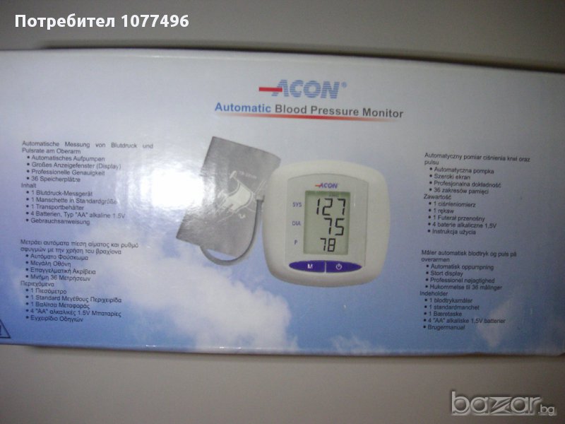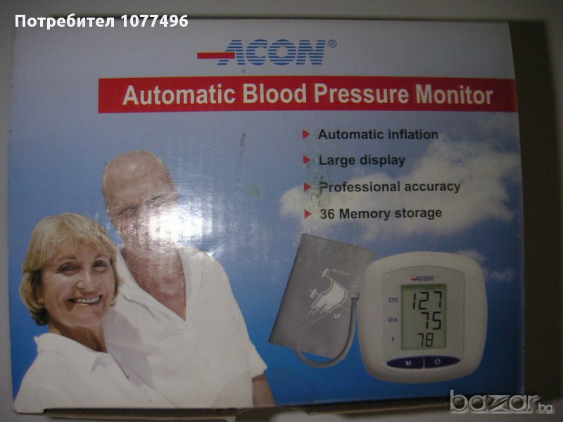 Американски напълно автоматичен апарат за измерване на кръвното налягане над лакътя и измерване на пулс. Ръководство на английски и френски език и индикация за правилно поставен маншет. Памет за 36 измервания.