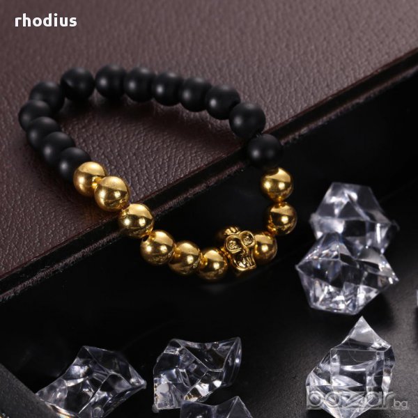 Мъжка гривна от черен матиран оникс, декорирана със златисти мъниста и череп от медицинска стомана.
