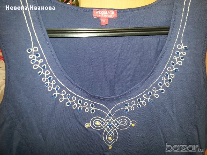 Дамска блуза без ръкав, тип потник, тъмносин цвят, с извезани шевици, камъчета и връзки отстрани на кръста за пристягане. Размер около S-М или №42-44. Отговарям на съобщения тук, изпращам с куриер с отстъпка, преглед и тест, или лично предаване в София.