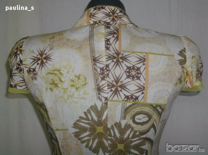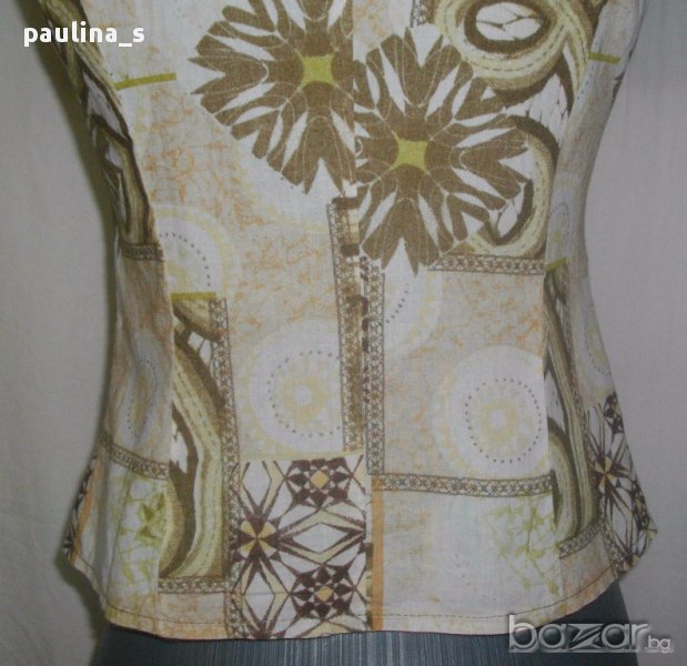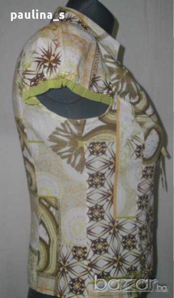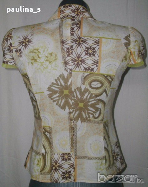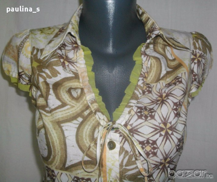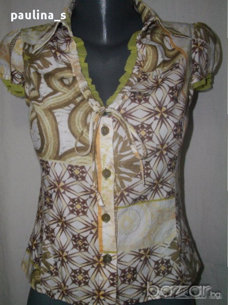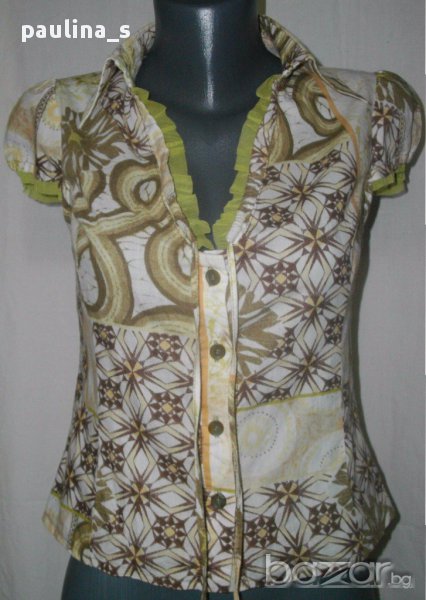 1. S / M / Колаж / Пъстра памучна риза / блуза, с декорирано деколте и вталяване, има и връзки отпред за коригиране на бюста, декорациите са от тюлени волани на деколтето и ръкавите. Ръкавите са къс буфон, копчетата с в същата цветова гама. Перфектна.