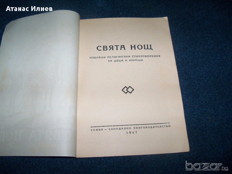 "Свята нощ" - избрани религиозни стихотворения за деца и юноши. Книжката е издадена по времето на комунистическия режим, 1947г. от синодално книгоиздателство. Художник Вадим Лазаркевич. Книжката е с меки корици, 48 стр. в отлично състояние.