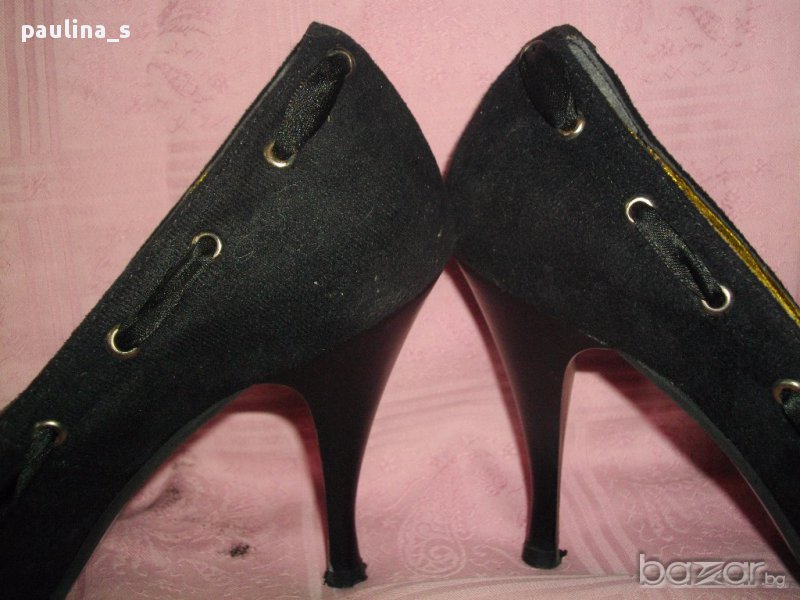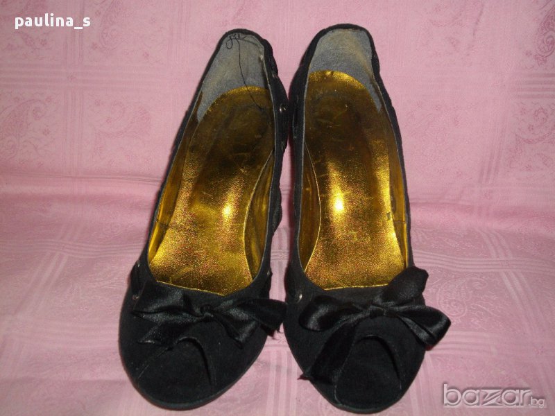 Черни дамски луксозни обувки с висок ток. Моделът е класика в жанра, не излизащ от мода-винаги актуални. Произведени са в Гърция, за износ в Италия. Материята е черен еко велур, освежен със сатенена лента, завършваща като пандела отпред. Моля, разгледайте и другите обяви и последвайте профила. При покупка за над 70лв, поемам част от доставката до офис на Еконт и правя отстъпка от общата цена, така цената за доставката не изглежда толкова непосилна. Приятно разглеждане. Продажбата е с благотворителна цел, крайна цена. Благодаря за вниманието 🙂