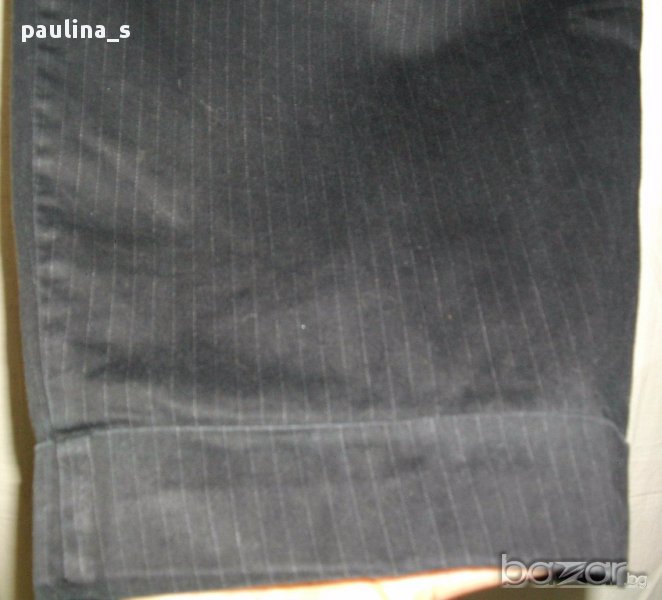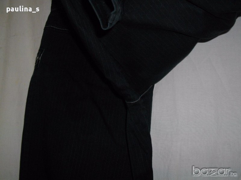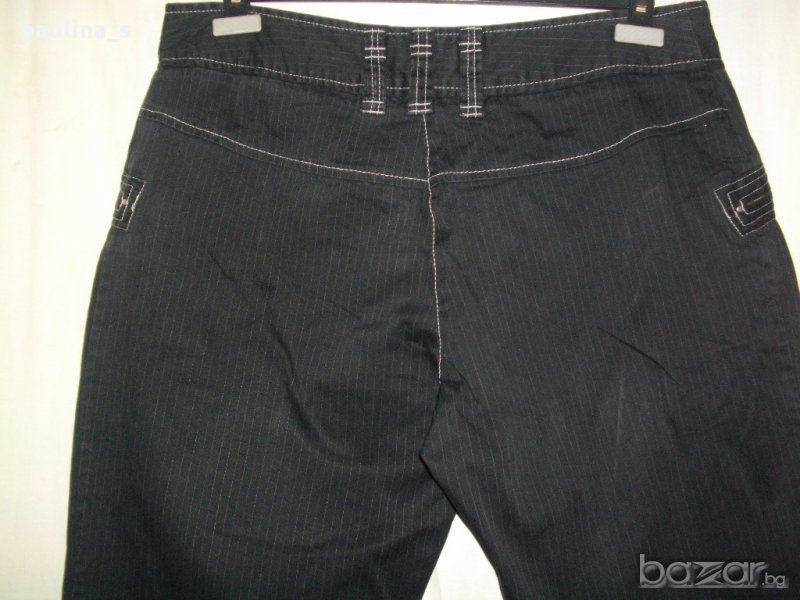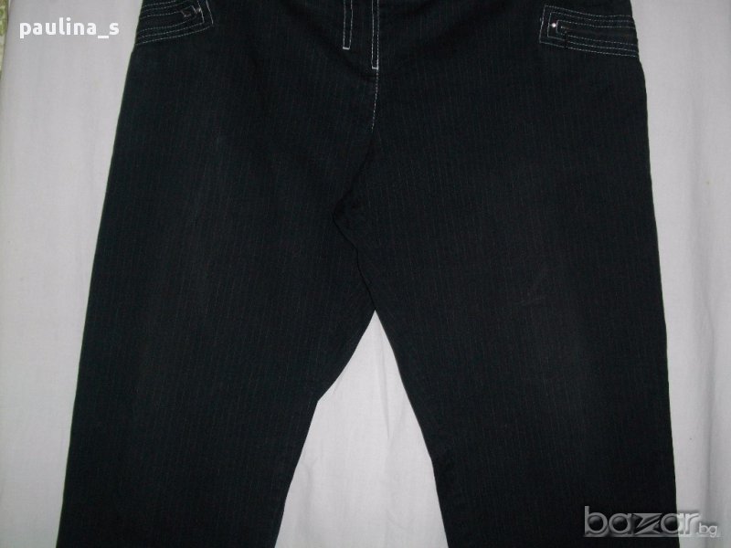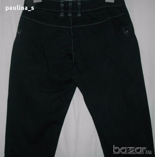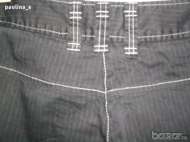 Дамски дизайнерски дънкови бермуди. Платът е еластичен памук с % ликра, като е освежен с малки бели вертикални райенца, съобразено с размера, за да издължава фигурата. Джобовете са странични с ципове, не променящи шеипът на ханшовата извивка. Маркировъчните украсителни тегели са контрастни, подчертаващи уникалността на модела. Талията е нормална, като гайките позволяват само колан за ханш или подходящ цветово летен шал! Без забележки.