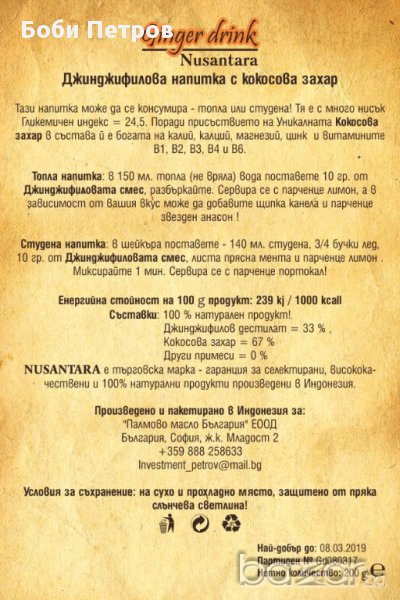 Съдържание : 100 % натурален продукт ! Джинджифилов дестилат = 33 % , Кокосова захар = 67 % други примеси = 0 %