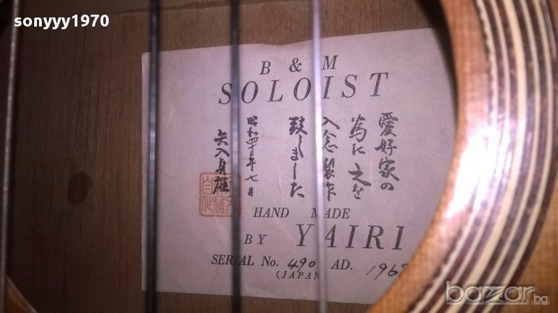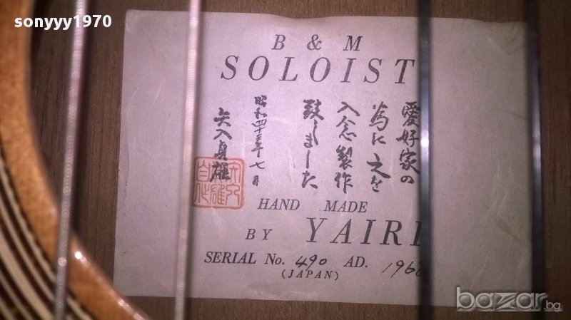АНТИКА МУЗЕЕН ЕКСПОНАТ-B&m soloist-hand made by yairi ad.1968-japan-внос швеицария...японска китара ръчна изработка от 1968г...с калъв комплект...за ремонт е леко е пукната лицево само-вижда се на снимките...внесена е вчера от швеицария...размери 99/38/9см-поръчки само тук в саита-пращаме със спиди или еконт с преглед и тест след превод на капаро за куриерската услуга поради зачестили некоректни потребители-поръчки само тук в саита! по телефона и със смс не! краини цени! бартери не правиме! ПАРИ НЕ ВРЪЩАМЕ! всеки ден нови неща-още 2-3 наши обяви тук