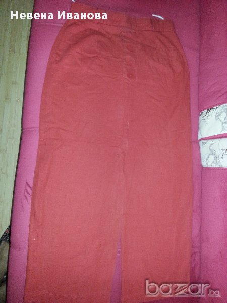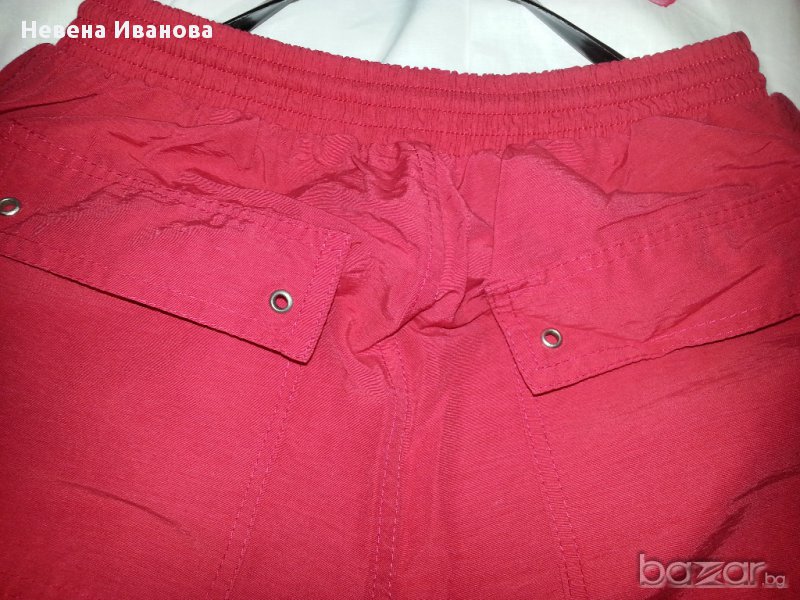 Дамски летен панталон три четвърти с ластик на кръста и с пристягане на крачолите. Цвят червен, материята е много здрава, български номер около №42-44 до 46 - в талията е еластичен. Отговарям на съобщения тук, изпращм с куриер с отстъпка, преглед и тест, или лично предаване в София.
