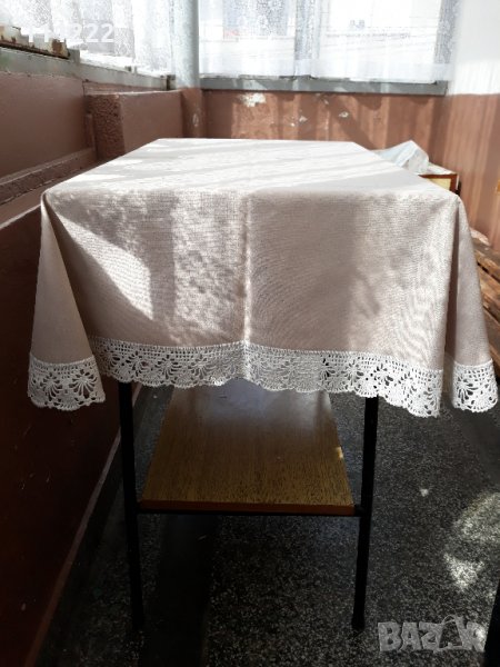 за правоъгълна масичка, монтирано от 6 броя парчета наплетени на една кука. Размер: 57/36 см. Цвят на плата - бежов, цвят на конците – екрю (много фина плетка - с мого тънки конци, много сполучливо монтирана без следи от срещането, възли и пр.) + 2 бр. подложки за сервиране (салфетки) от същия модел и от същия плат, но наплитаното е с 2 ката от конеца - т. е. по-плътно и стои като колосан; размери 19/19 см.