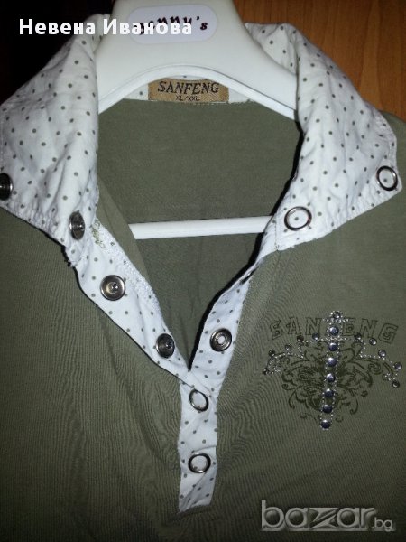 Лятна дамска блуза с къс ръкав цвят сивозелено - "каки" в комбинация с бяла яка на точки, от ляво има надпис, капси и камъчета. Размер М, бюст отпред 42 - до 46 /обиколка 84-92 см/, дължина на блузата - 57 см. Отговарям на съобщения тук, изпращам с куриер с отстъпка, преглед и тест, или лично предаване в София.
