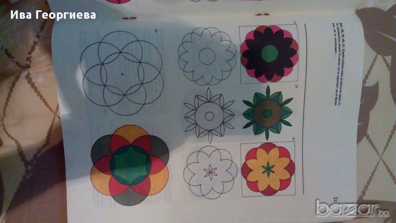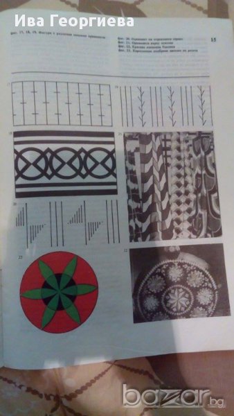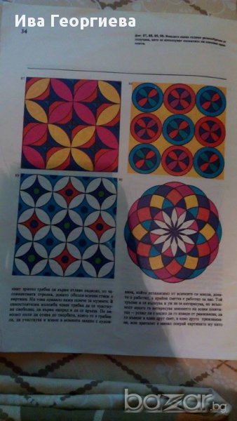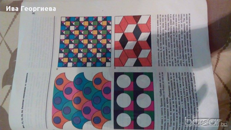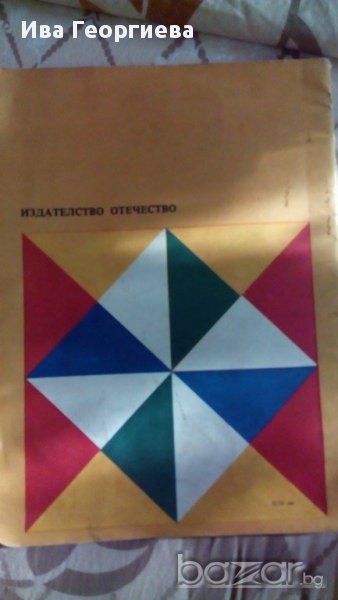 Автори:М. Манев, Л. Трифонова, И. Гълъбов; Художник: : Йова Чолакова, Издателство: Отечество; Година на издаване: 1984; Страници: 38 с текст и цветни фигури; Формат: 160/250/5 мм; АНТИКВАРНА * В книгата са изложени начините на чертане и оцветяване на орнаментите – своеобразен израз на творческо търсене и красиво съчетание на различни геометрични фигури.