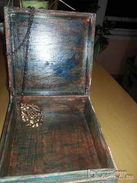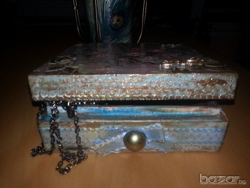 Дървена кутия с винтидж декупаж,дорисуване и краен лак.Размери 16х16 см-квадратна.Подходяща за бижута или други дребни нещица!