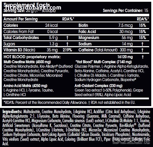 Scitec Nutrition Hot Blood 3.0 е истинско откритие сред пред-тренировъчните продукти. Целта на Scitec Nutrition Hot Blood 3.0 e – увеличаване обема на мускулните клетки, увеличаване нивата на азотен оксид за напомпване на мускулната маса, осигуряване на стимулиращи енергетици и оптимизатори на менталния фокус.