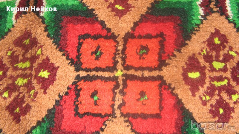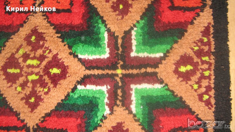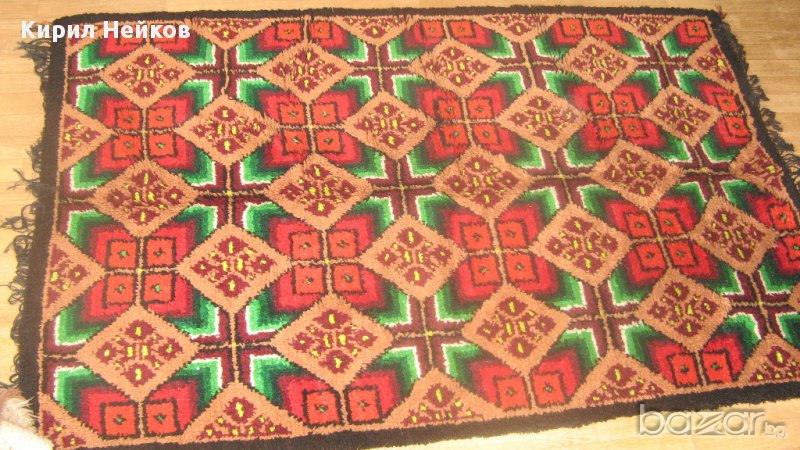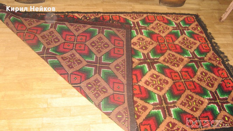 Съхраняван е в нафталин - перфектно състояние. Размери: 125 х 195 см. Ярки цветове и традиционни български шарки. Подходящ е за постилане върху легло, окачване на стената като украса или ползване като дебел килим. Гарантиран уют и усещане за топлина във Вашия дом, вила или механа.