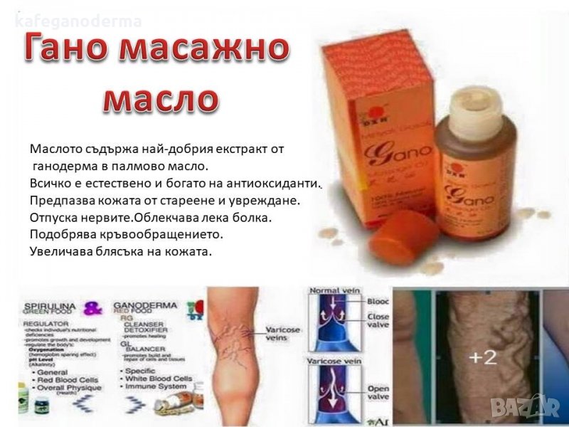 Съдържа най-високо качество палмово масло и екстракт от Ганодерма (рейши). То е отличен аксесоар за всеки масаж. Палмовото масло е богато на витамин Е, който е мощен антиоксидант и може да намали броя на вредните свободни радикали в организма. Използва се за всяка възрастта и тип кожа. Направено е от натурални съставки и е подходящ за ежедневна употреба и за чувствителна кожа. Прилага се за леки наранявания, изгаряния, мускулни спазми и болки в ставите и сухожилията. Използвайте Гано масажно масло като нов начин за прилагане на вашият масаж. Рейши (ганодерма) спира възпалителните процеси и действа успокояващо на кожата. Може да се ползва и за интимните области.