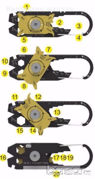 Оборудван с щипка за бързо освобождаване, лесно се прикрепя към ключодържател или колан. А въртящия диск служи за защита и съхранява безопасно всички инструменти, когато не ги използвате.