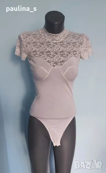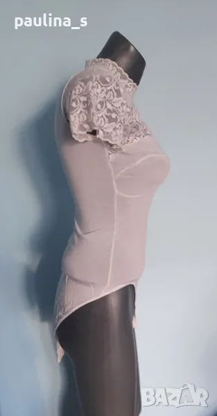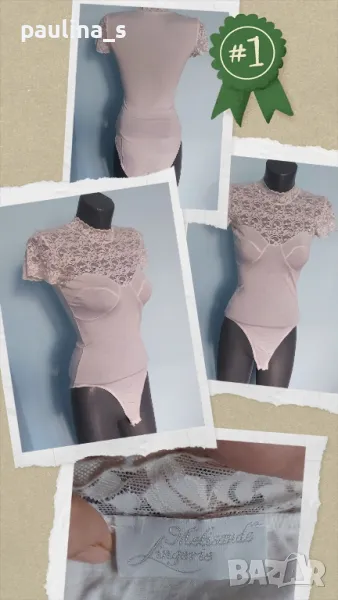 1. Колаж / M / XL - "Melisande lingerie" Луксозно еластично боди с бюстие в горната част. Цената е крайна 14,99лв. Дантелата е много еластична, трикото е от памук и вискоза, умерено еластично. Дрехата е маркова с много романтичен стил. Горната част е оформена като бюстие с романтично деколте и поло от дантела. Може да се носи като блуза под сако или топ(елек), или самостоятелно по избор на притежателката. Не е ново, но е без дефекти, без дефекти и на интимните части.