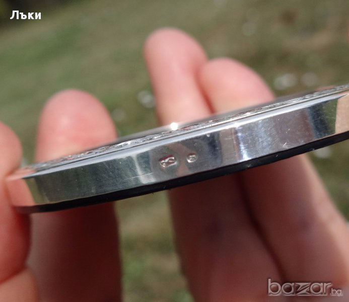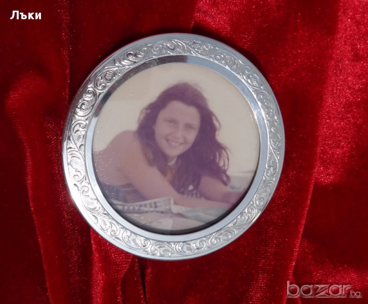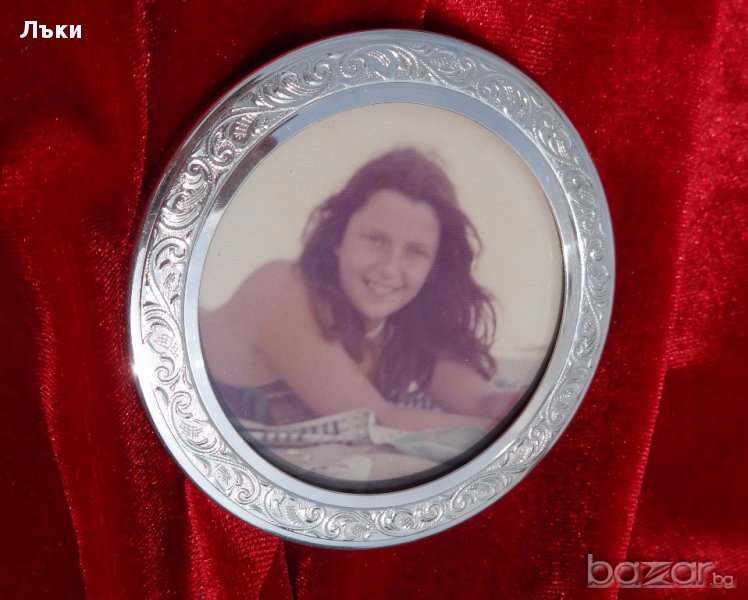 Сребърна рамка за снимка,за стена,декорирана с великолепни релефни инкрустации,орнаменти.Сребро проба 925,маркирана с два знака,диаметър 6 см.,дебелина 6 мм.,тегло 22 гр.