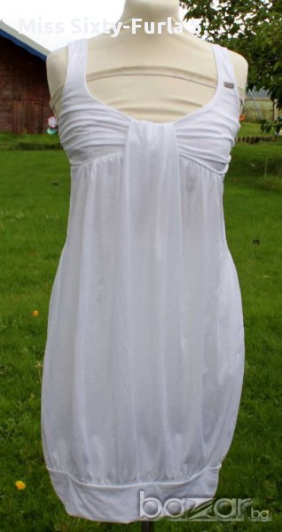Бяла лятна рокля Мис Сиксти от приятна прохладна материя с две странични джобчета и красиво оформящо бюстие. Нова с етикет, S размер, дължина от рамото - 97 см. Материя - 100% polyester.