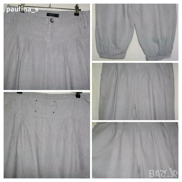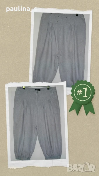2️⃣. Колаж / L / 2XL - Сиви потури тип шалвари "Paprika". Цената е крайна 29,99лв / 15 евро. Материята е мек Деним, без избелващ ефект. Талията е с широка платка, под която следва разширение, за сметка на четири басти от двете страни - отпред и отзад. Джобовете са шпиц и започват от платката. Гайките са широки и позволяват да се носи широк колан. Долу завършват с ластичен маншет. Не са нови, но са без дефекти.
