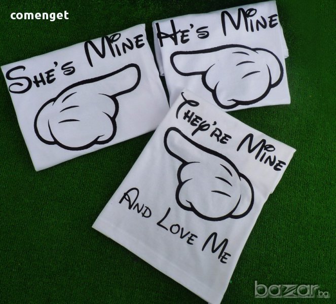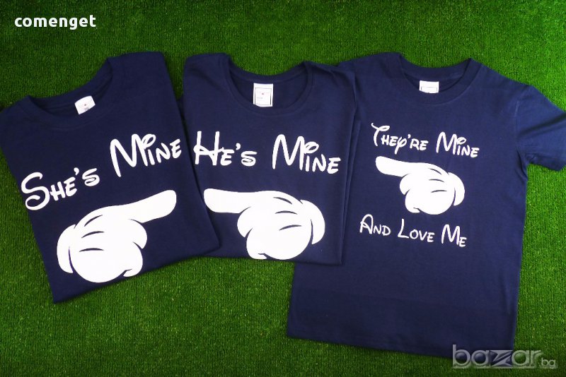 ФАМИЛНИ ТЕНИСКИ - СТРАХОТЕН ПОДАРЪК! УНИКАЛНИ ТЕНИСКИ МИКИ МАУС / MICKEY MOUSE HE'S MINE & SHE'S MINE & THEY ARE MINE В ЦВЯТ ПО ТВОЙ ИЗБОР МАМА, ТАТКО И АЗ! Разполагаме с всички размери от S до 2XL от дамската и мъжката серия и размери от 4-5 до 14 години от детската серия. Налични и с дълъг ръкав от мъжката и дамската серия на цена 20,90 лв.