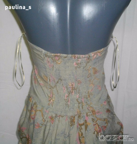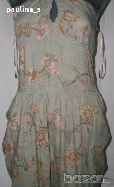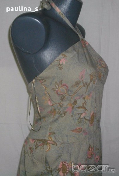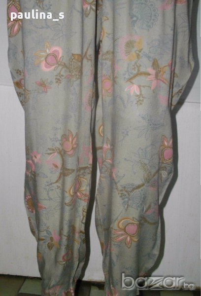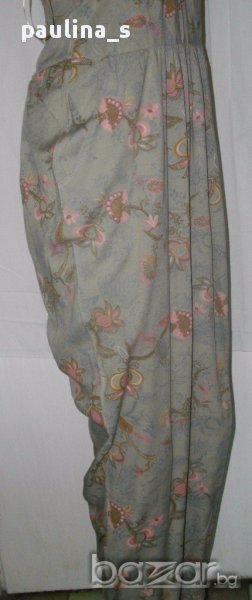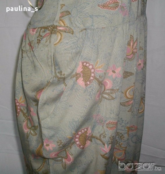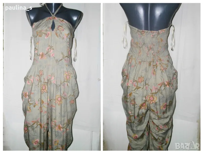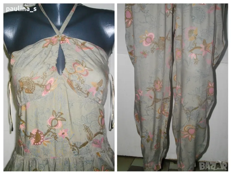 1. Колаж / "H&M". Цената е крайна 24,99лв. Брандов гащеризон в зелен флорален принт. Горната част е с кройка на бюстие с наборен отвор между гърдите, отзад фиксирано с множество вшити хоризонтално ластици. Долната част е средно дълбока с висока талия и предни шпиц джобове. Материята е вискоза и памук. Размер по етикет М, но може да се носи и до XL, слаган е само на манекен!