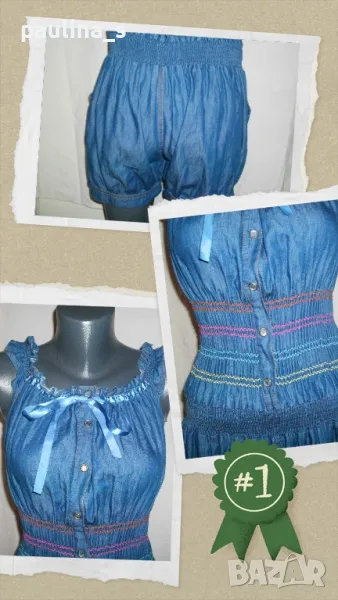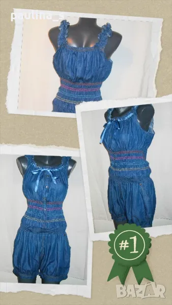Дънков гащеризон с декорации и набори. Цената е крайна 29,99лв. Материята е тънък Деним, без еластичност. Моделът покрива няколко размера. Като нов, една бройка, без дефекти и етикет.