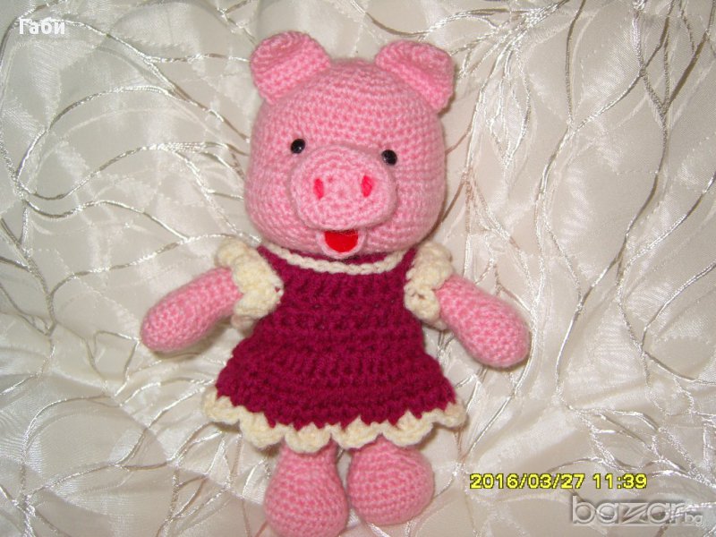 Ръчно плетена играчка- прасенце. Изработена от висококачествена прежда, в два варианта- с и без рокличка.Височина- около 22 см.