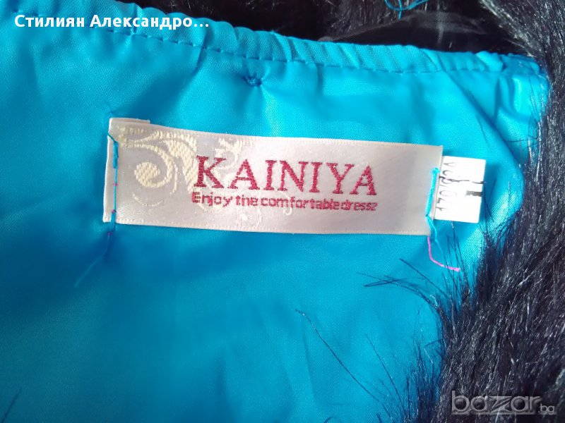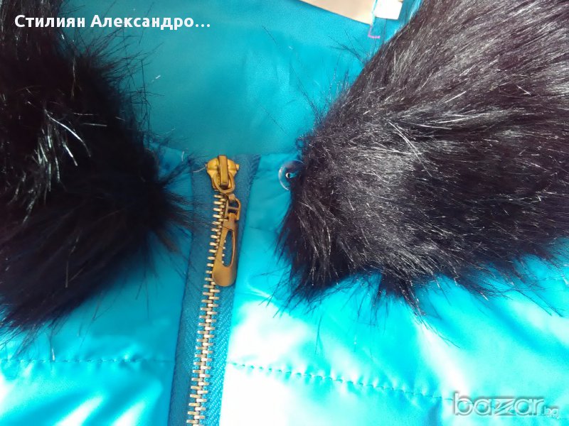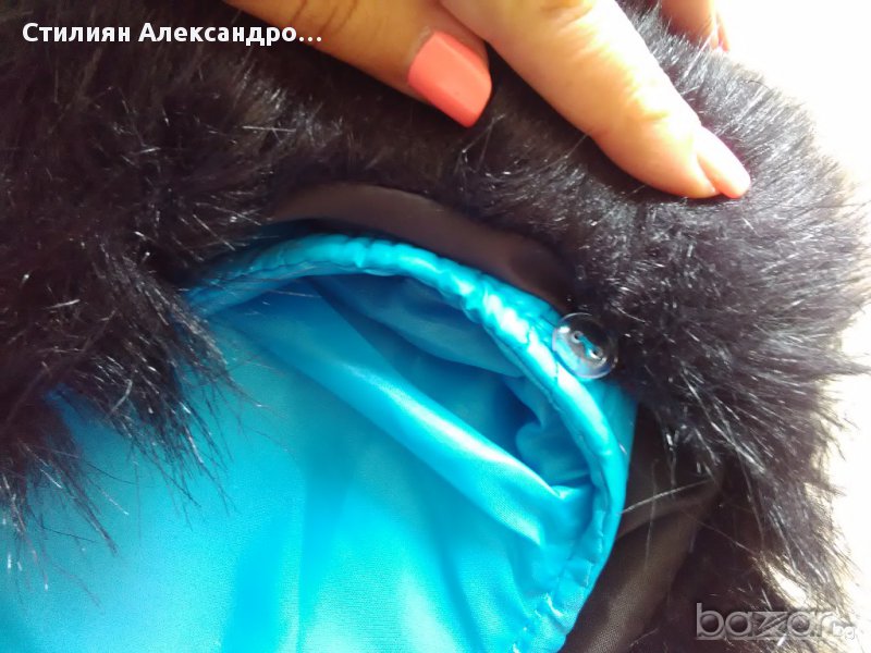 Има пухена яка, която е прикачена с копчета и е подвижна.