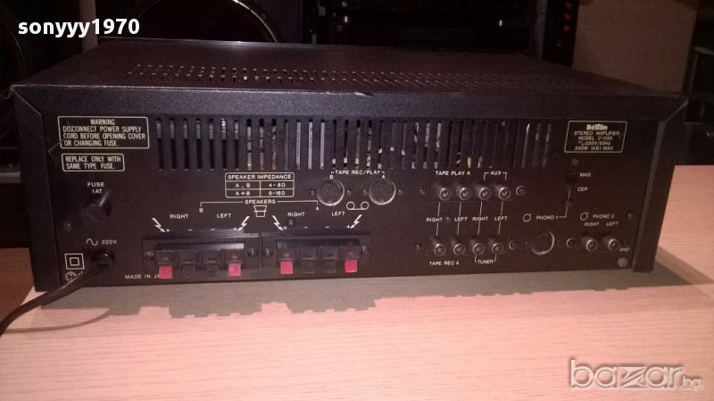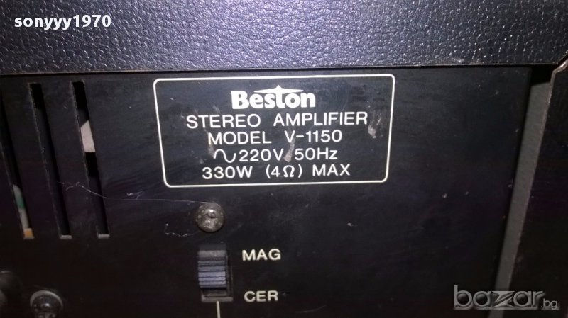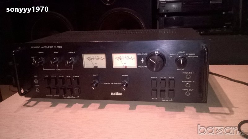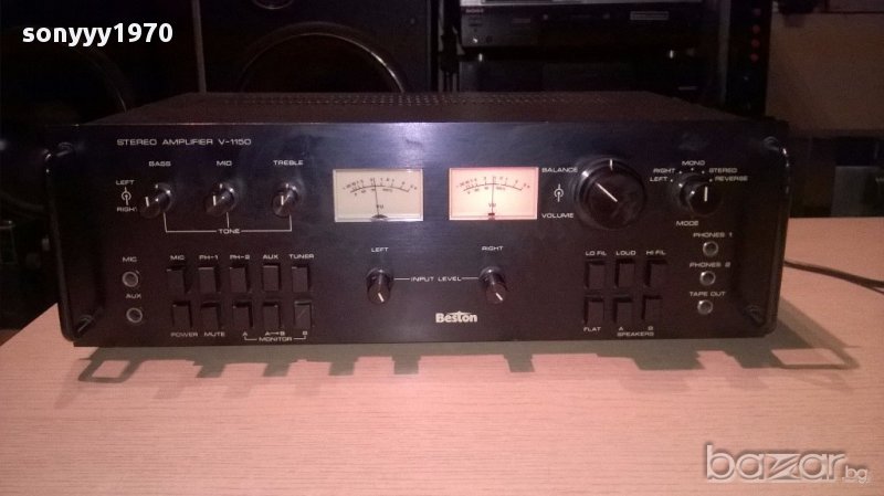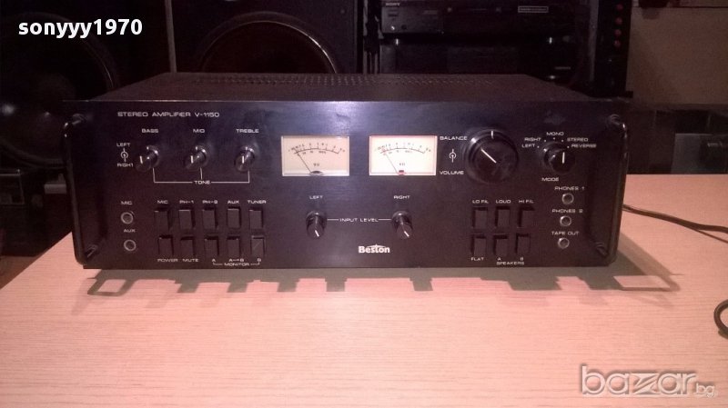 Beston v-1150 stereo amplifier/330w-made in japan-внос швеицария....марков японски метален звяр...без ремонти и забележки...с стрелкови индикации...тежка и яка машина...изходи за 4 колони и свири идеално...входовете се регулират с потенциометри и тонкоректора е с високи и среди и бас...ретро машина от едно време в свеж вид-от днес 28.02.22г пращаме със спиди или еконт с преглед и тест след превод на капаро за куриерската услуга поради зачестили некоректни потребители-поръчки само в тук в саита! по телефона и със смс не! краини цени! бартери не правиме! всеки ден нови неща-още над 18000 обяви тук