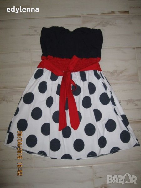 Свежа рокличка на точки в тъмно син цвят и червен колан. В горната част е тип корсет, изработен от трико и има еластичност /широчина на бюста в свободно състояние - 32 см./. Червеният колан отзад е с ластик и има голяма еластичност /ширина в свободно състояние - 32 см./. Надолу е разкроена изработена от памучен плат. Дължина на роклята - 64 см. Цена - 25 лв.