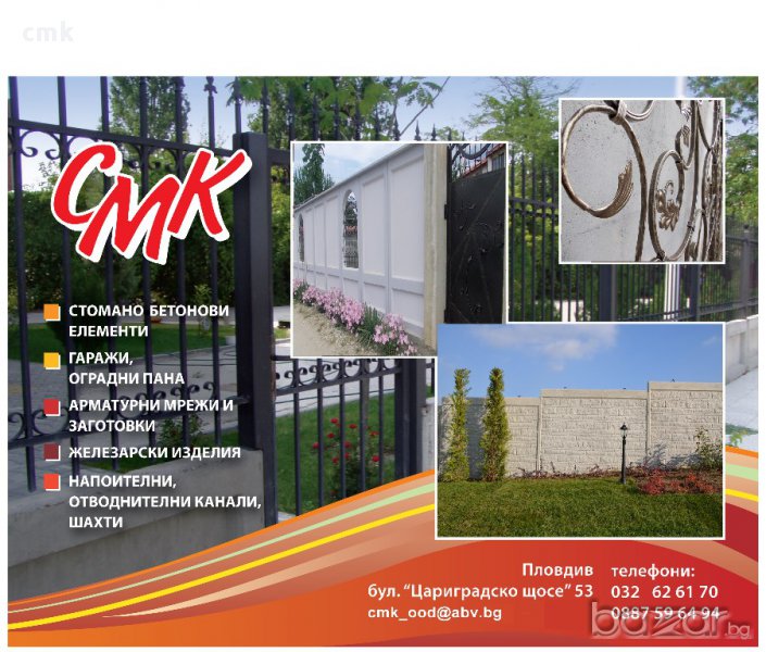 ОГРАДИ, гаражи и елементи – панели, шахти, канални корита, арматурни мрежи и заготовки и железарски изделия – оградни пана, парапети, врати (плъзгащи и отваряеми), решетки.