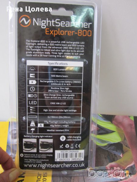 ED фенерчеExplorer 800 е мощеняи и идеален за професионална употреба.Има 3 леки режими, за да изберете от: високо, ниско и светлинни ефекти. Осъществено от 3.7V литиево-йонна батерия, в продължение на 3 часа на високо, 28 часа на слаб и 7 часа на светлинни ефекти с едно зареждане. Презарежда чрез USB кабел и се отличава с LED индикатор за зареждане.