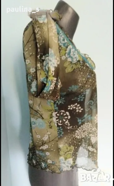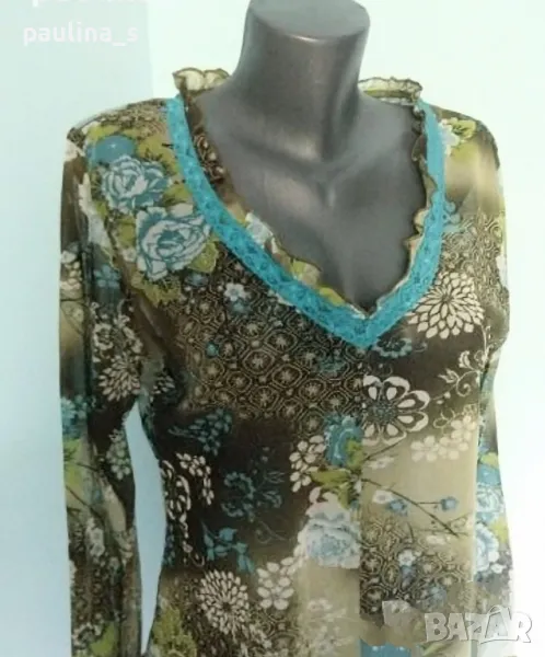 3️⃣ . Колаж / L / 3XL - Екзотична еластична блуза / топ "Promiss". Цената е крайна, без пазарлъци 10 евро. Дизайнерска блуза с весел флорален принт. Моделът е обран, втален с фуния ръкави, краищата завършват на оверлог, къдрав завършек. Деколте V образно с дантела в цвят Тюркоаз и къдри, като нова, без дефекти и етикет.