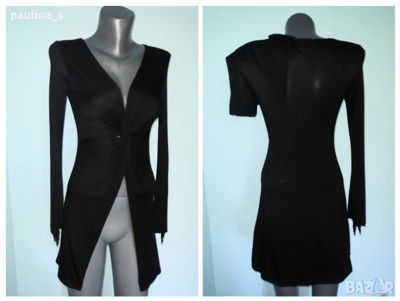 1️⃣. Колаж / M / XL - "extrOse" - Черна еластична блузка / топ. Цената е крайна, без пазарлъци 5 евро. Материята е памук и ликра и покрива няколко размера, дрехата е една. Деколтето е прекръстосано, като предниците не са зашити, а падат свободно. За долната част остава да се носят открити останалите части на тоалета(или пъпа, особено ако е с пиърсинг!) Ръкавите са също цепнати от нивото на лакъта.
