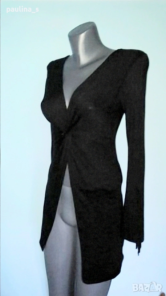 1️⃣. Колаж / M / XL - "extrOse" - Черна еластична блузка / топ. Цената е крайна, без пазарлъци 7 евро. Материята е вискоза и ликра и покрива няколко размера, дрехата е една. Деколтето е прекръстосано, като предниците не са зашити, а падат свободно. За долната част остава да се носят открити останалите части на тоалета(или пъпа, особено ако е с пиърсинг!) Ръкавите са също цепнати от нивото на лакъта.